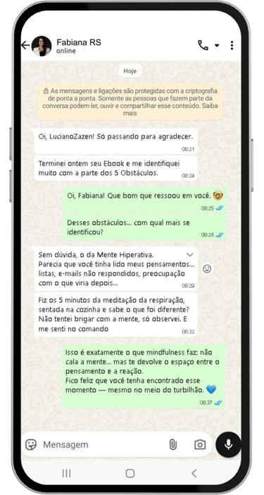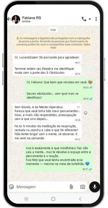 Porque olhar para dentro por apenas 5 minutos interrompe o modo automático do estresse, devolvendo clareza, foco e controle emocional — mesmo no meio do caos. Junte-se à nossa comunidade exclusiva de Inteligência Artificial HUMANA - onde tecnologia e bem-estar se encontram para criar profissionais mais resilientes e criativos. Como diz o ebook: "Atenção plena não elimina a ansiedade — ensina você a não se afogar nela."